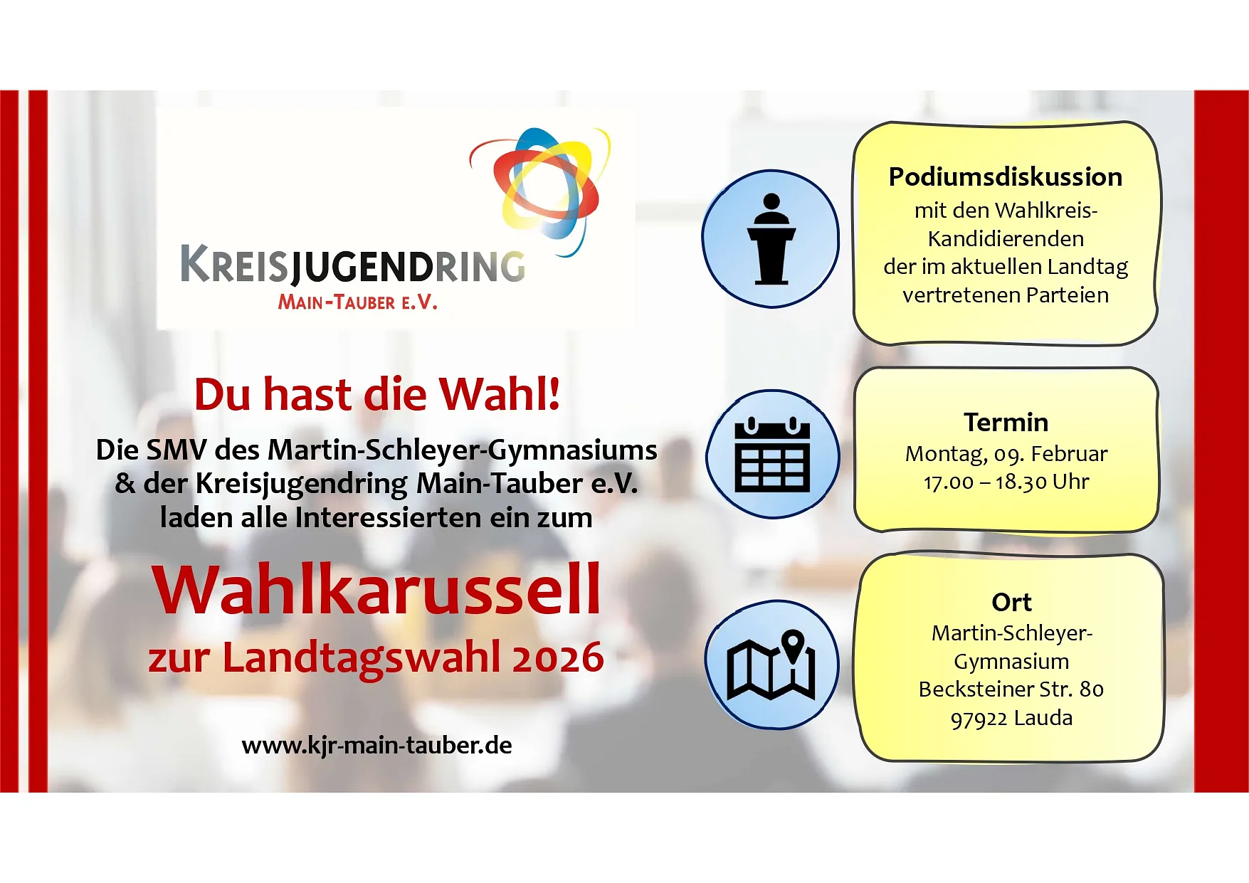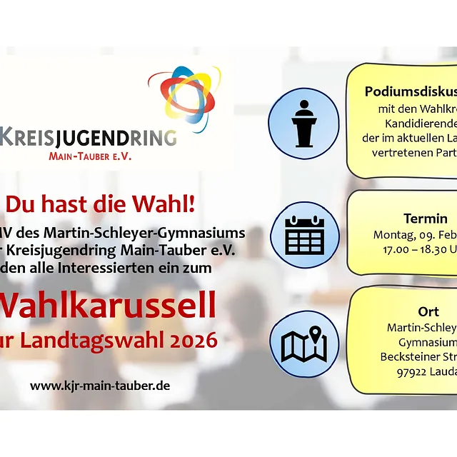 Politik muss nicht trocken sein – sie kann direkt, interaktiv und vor allem laut werden! Die SMV des Martin-Schleyer-Gymnasiums und der Kreisjugendring Main-Tauber e.V. laden euch herzlich ein, beim diesjährigen Wahlkarussell zur Landtagswahl 2026 dabei zu sein. Am Montag, 09.02.2026, 17:00 - 18:30 Uhr im Martin-Schleyer-Gymnasium, Becksteiner Str. 80 in 97922 Lauda.