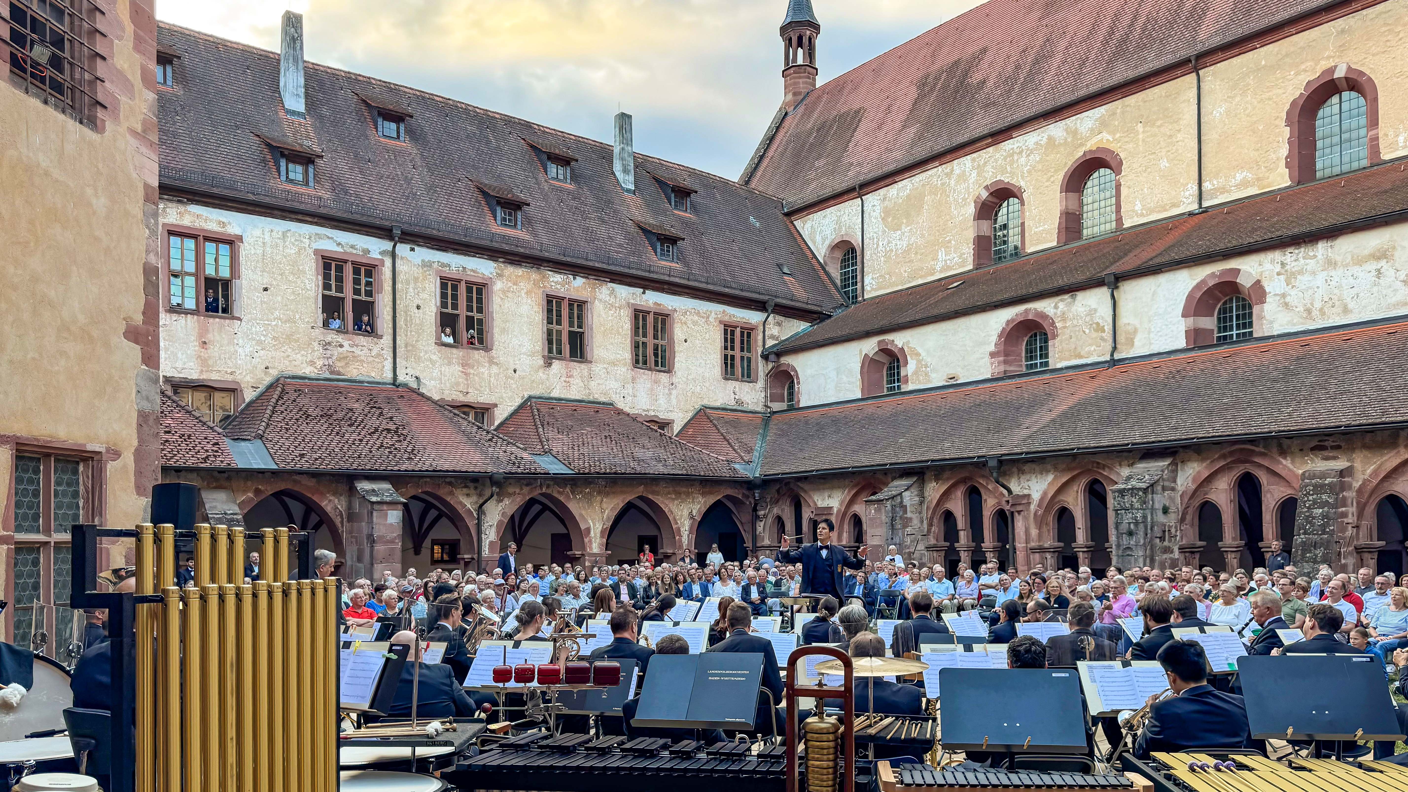Das Landespolizeiorchester Baden-Württemberg hat am vergangenen Donnerstag ein Benefizkonzert im Kloster Bronnbach gespielt. Dabei wurden Spenden von mehr als 7000 Euro für die Arbeit des Fördervereins Aktionskreis Sucht- und Gewaltprävention, Sicherheit und Gesundheitsförderung im Main-Tauber-Kreis e.V. (Förderverein AkS) gesammelt. Die mehr als 380 Besucherinnen und Besucher im voll besetzten Kreuzgang-Innenhof waren von dem vielfältigen Programm mit Klassik, Pop, Filmmusik und Jazz rundum begeistert und spendeten zum Abschluss Standing Ovations. Vor Beginn des Konzerts wurden vom Team des Klosters noch eifrig zahlreiche Stühle herbeigetragen, bis jeder einen Platz gefunden hatte.