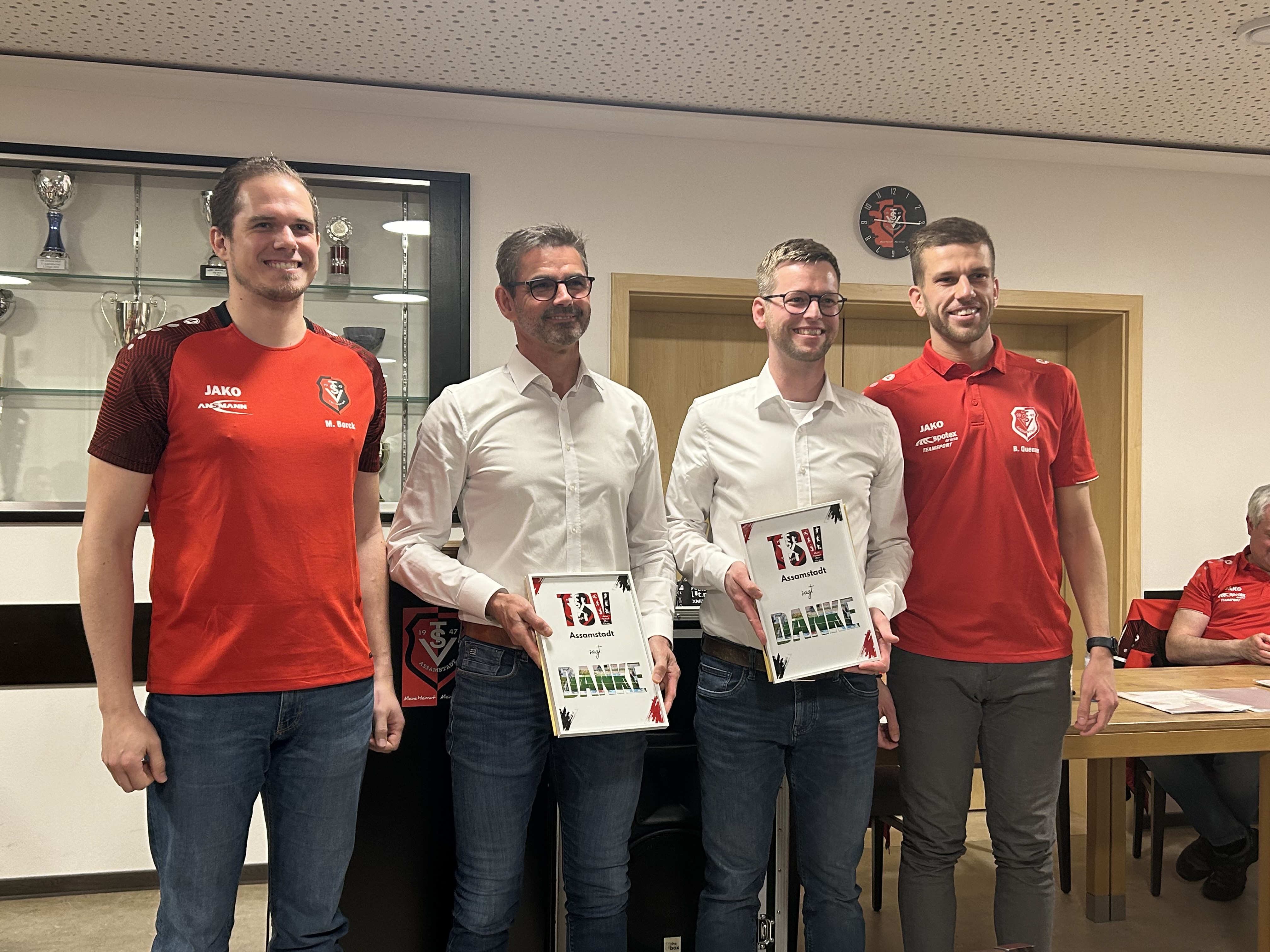 Die beiden neuen „Frontmänner“ des TSV Assamstadt, Bastian Quenzer und Markus Borck, ließen es sich freilich nicht nehmen, sich bei ihren Vorgängern Christian Hügel und Christian Geißler für deren unermüdlichen Einsatz zu bedanken. Sie nannten deren Wirken außergewöhnlich und überreichten den beiden eine Urkunde.