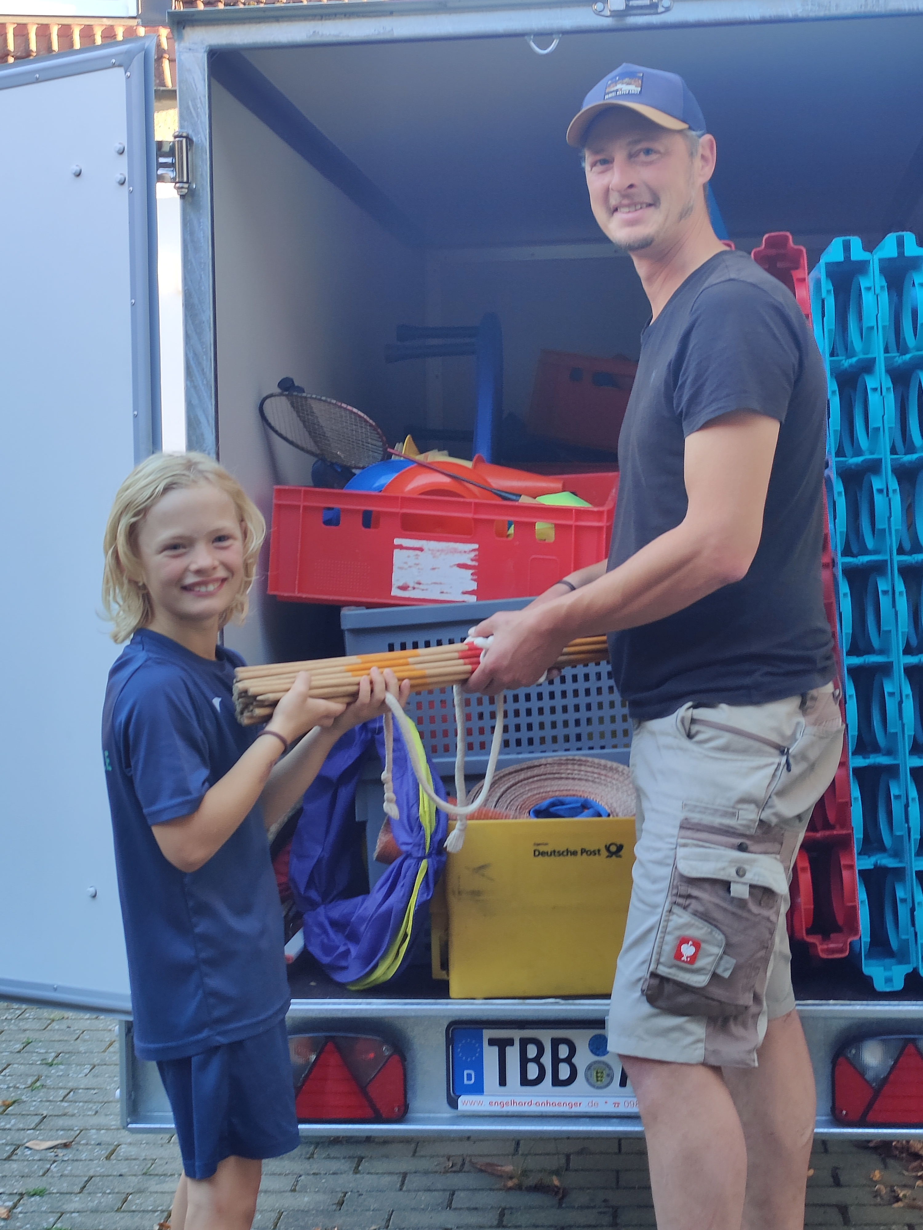 Die Entleihtermine werden vom Büro der Sportjugend aus koordiniert. Die endgültigen Absprachen werden dann bezüglich Abholung und Rückgabe mit Herrn Ott direkt abgewickelt. Hier geht ihm sein Sohn Joshua tatkräftig zur Hand.