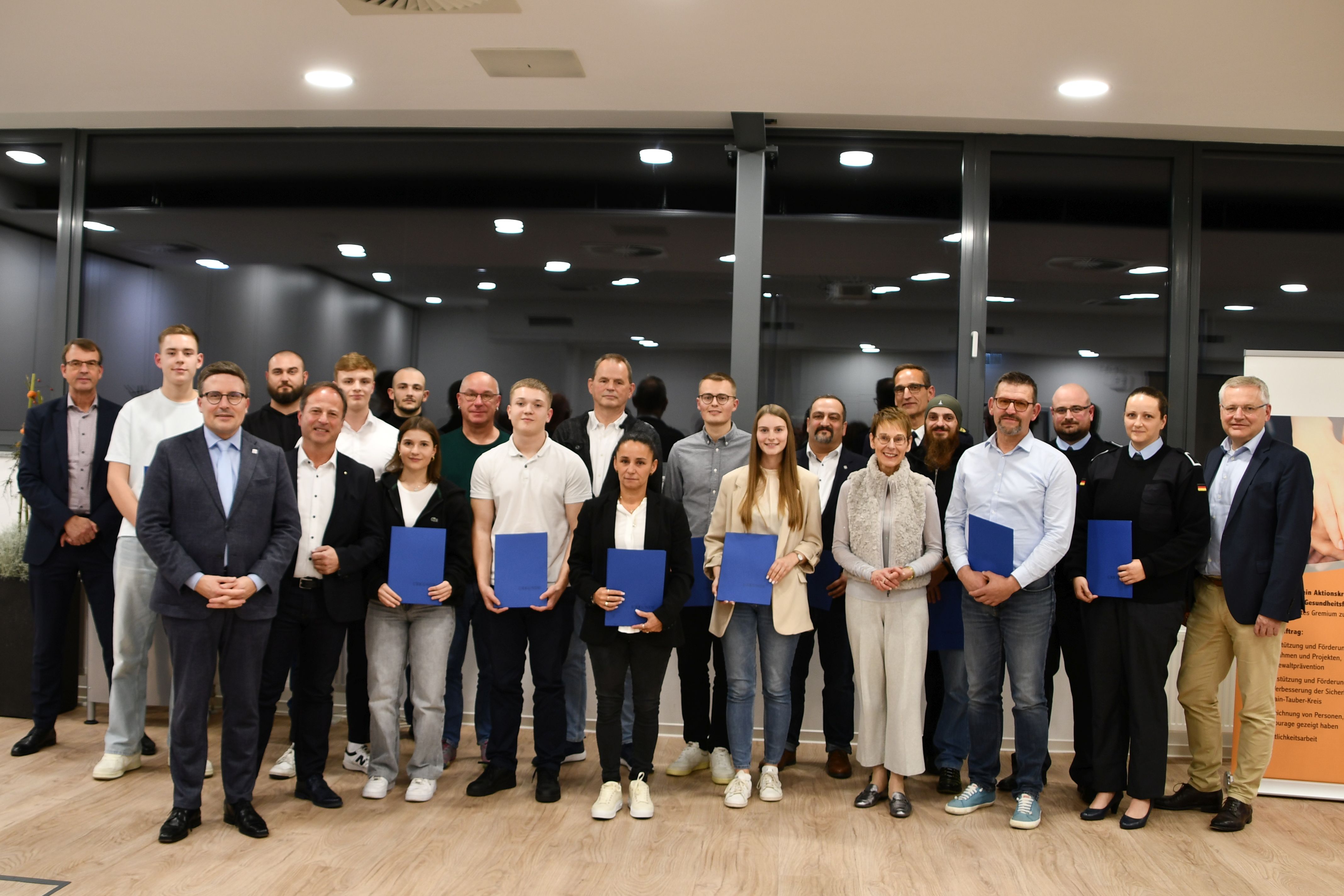Main-Tauber-Kreis. „Sie sind die Hauptpersonen heute“, betonte Landrat Christoph Schauder. Gemeint sind die 18 Menschen, die in ganz unterschiedlichen Situationen mitgedacht und ohne zu zögern geholfen haben, wenn andere in Not waren oder überrumpelt wurden. Vergeben wird der Zivilcouragepreis seit 2016 vom Förderverein Aktionskreis Sucht- und Gewaltprävention, Sicherheit und Gesundheitsförderung im Main-Tauber-Kreis (Förderverein AkS). Bei einer ansprechenden Feier im Sitzungssaal des Landratsamts wurden die Preisträger für ihr mutiges und uneigennütziges Handeln gewürdigt.