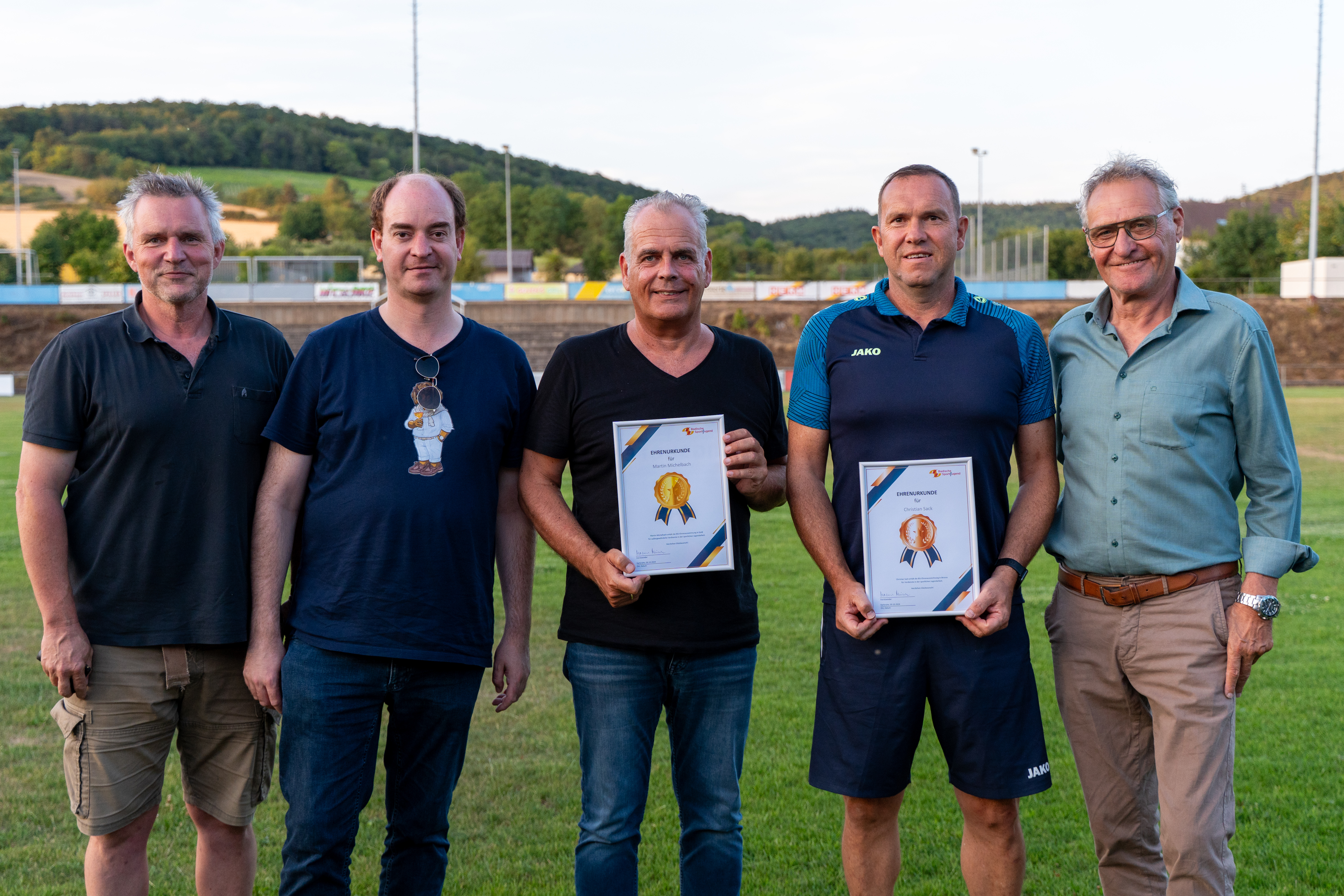 Das Bild zeigt von links: Michael Geidl, Sportkreisjugendreferent, Dr. Lukas Braun, Bürgermeister, Martin Michelbach (Gold), Christian Sack (Bronze), Herbert Bieber, SVK-Vorsitzender.