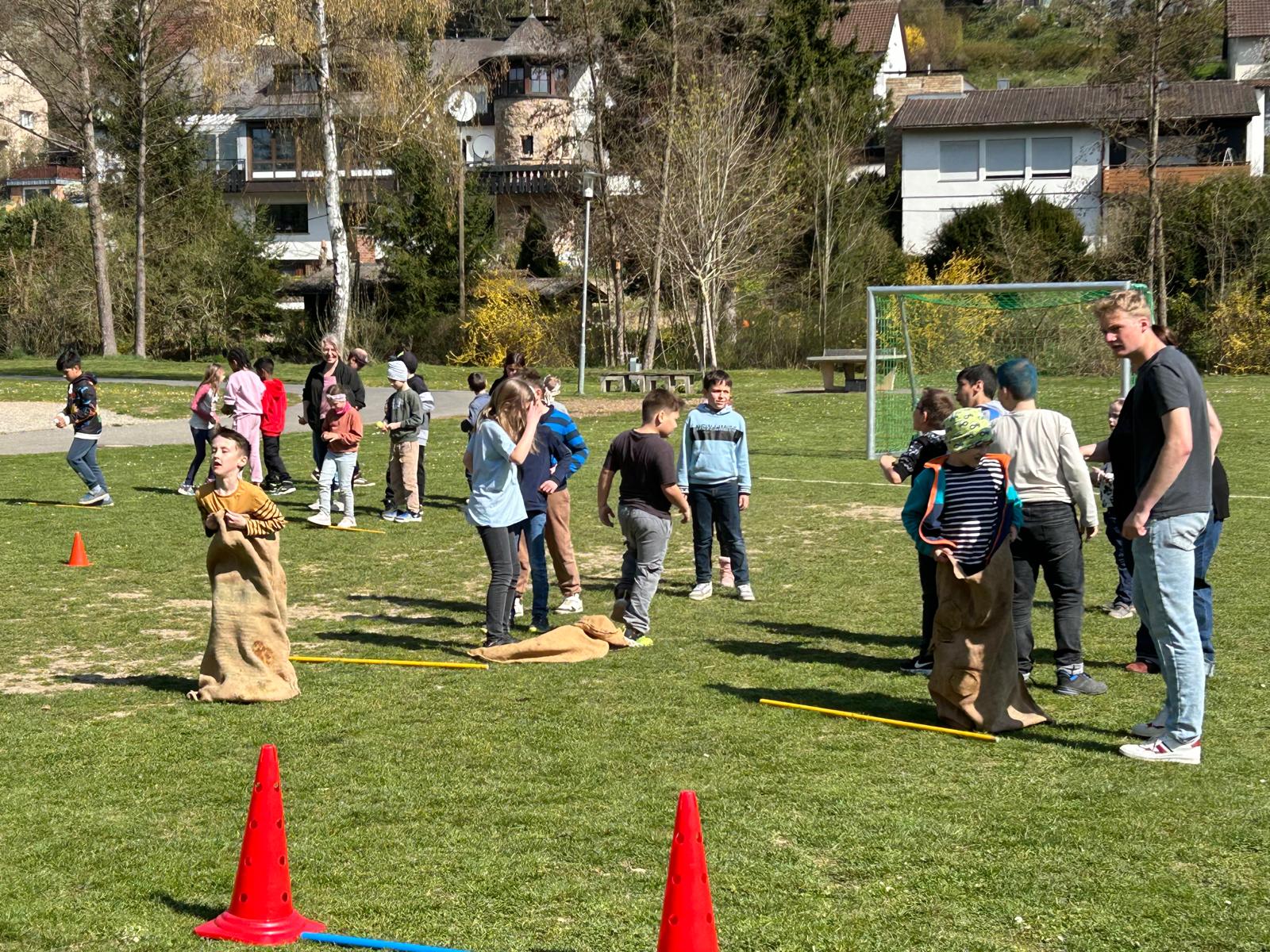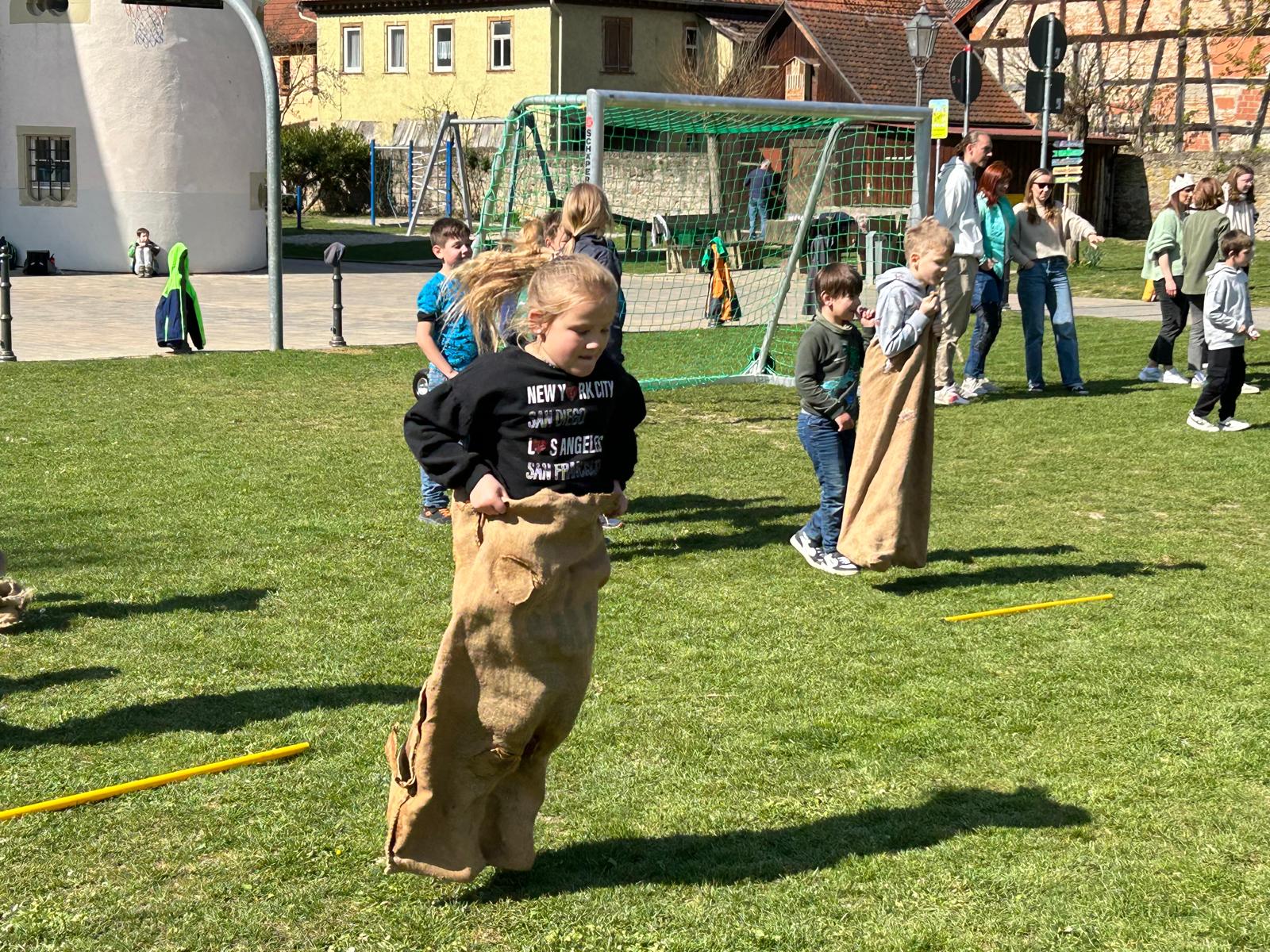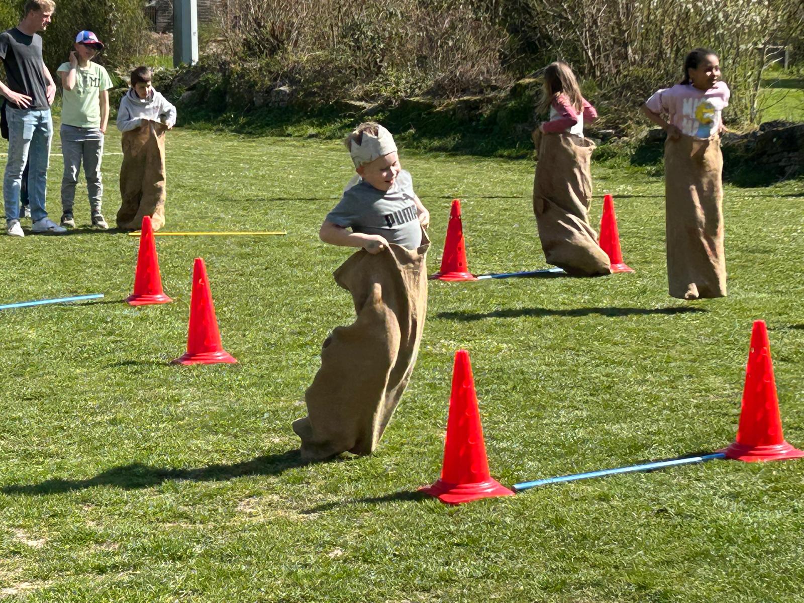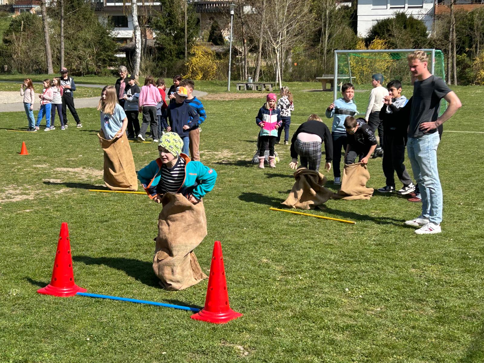Anschließend wurden die Kinder durch österliche Spiele wie Sackhüpfen und Eierlauf in Bewegung gebracht. Auch der Osterhase zeigte was er sportlich drauf hat und hoppelte über die Pausenwiese.
