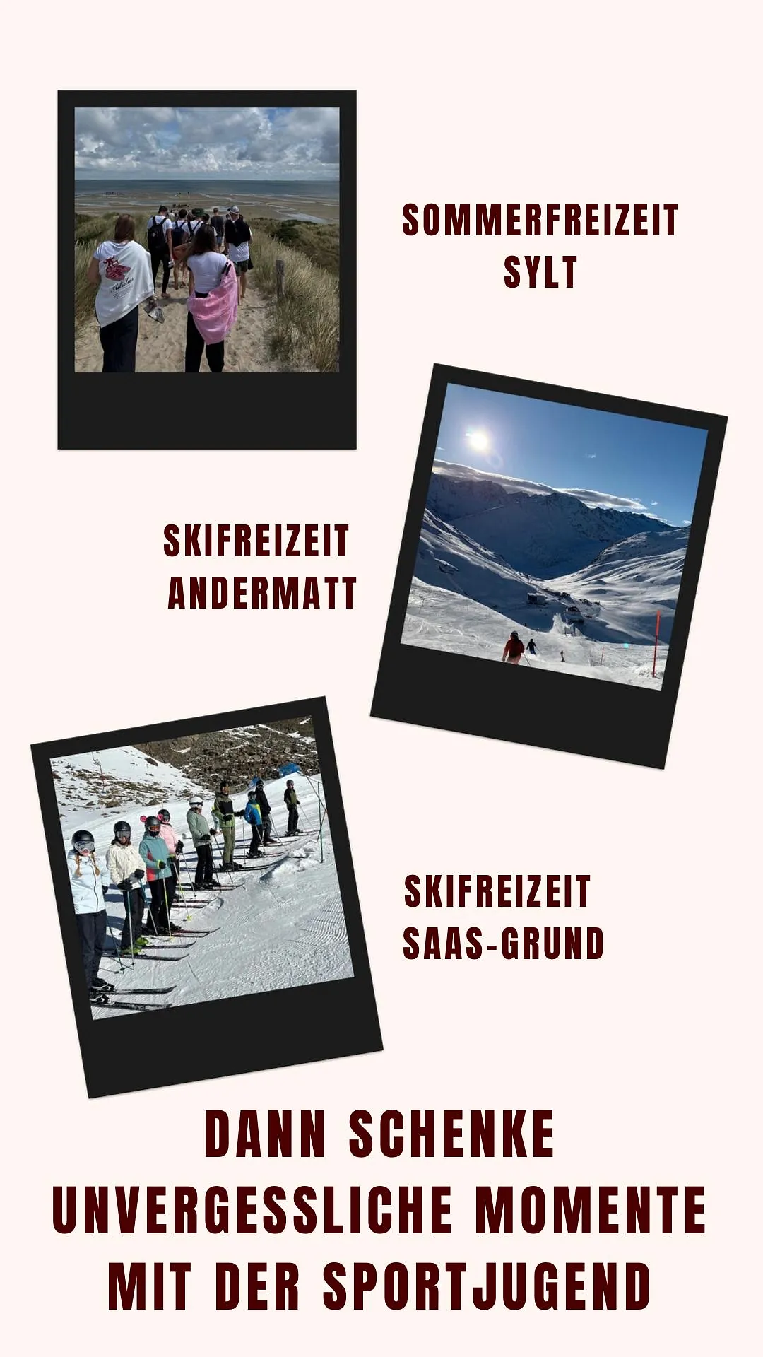 Verschenke dieses Jahr etwas, das wirklich bleibt: unvergessliche Erlebnisse! Unsere Jugendfreizeiten von der Sportjugend bieten genau das – Sonne, Meer und Action in Kroatien, Natur pur und Strandabenteuer auf Sylt oder jede Menge Schnee, Spaß und Ski in Saas-Grund.